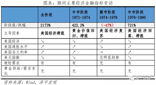 这一阶段黄金牛市基本遵循美国经济基本面和实际利率情况。第一,美国经济滞涨是主导这一阶段黄金价格上涨的主要因素,背后的原因包括通胀上行,美国经济增速显著下滑,美联储降低利率,实际利率大幅下降,资金外流,美元指数下降。第二,70年代出现两次石油危机,避险需求同样显著。但是,两次石油危机间,由于美国经济短暂复苏,黄金价格曾出现短期回调波动。