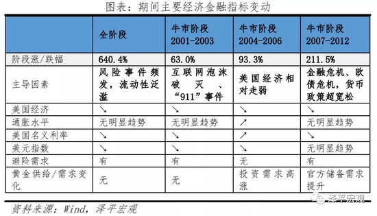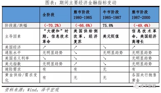 这一阶段黄金熊市主要遵循美国经济基本面情况。美国供给侧改革后,经济增长动力增强,叠加信息技术革命,经济潜在增长率提升,叠加通胀水平较低,实际利率上升,黄金价格整体呈下行趋势。