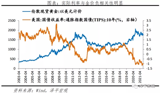 黄金作为大类资产之一,具有金融投资品的属性。在黄金的金融属性下,其价格受两大因素影响,一是由于黄金“零票息”,其价格与实际利率水平负相关,二是作为保值投资品,与通胀水平正相关。