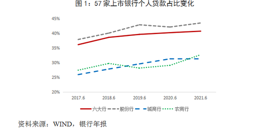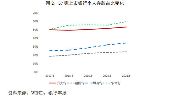 一是业务贡献度持续增加。从贷款来看,2017-2021年,57家A股和H股上市银行个人贷款占全部贷款的比例从36.2%上升到40.3%,与公司贷款占比差距进一步缩小;2021年6月末,六大行、股份制银行、城商行、农商行的个人贷款占比分别为40.7%、43.5%、31.3%、32.7%,六大行、股份制银行和农商行提升较快,分别同比增加0.5、1.4、3.6个百分点(图1)。从存款来看,2017-2021年,57家上市银行个人存款占全部存款比例从42.9%上升到45.3%,几乎占到半壁江山;2021年6月末,六大行、股份制银行、城商行、农商行的个人存款占比分别为53.2%、23.9%、34.4%、59.5%,分别同比增加1.7、0.7、2.3、4.1个百分点,其中六大行和农商行的个人存款占比已经超过对公存款(图2)。