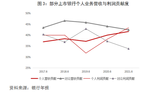 二是盈利贡献大幅上升。从部分上市银行的数据来看,个人业务营收贡献持续上升,从2017年上半年的36.9%上升到2021年上半年的41.6%,2019年后上升速度明显加快;对公业务的营收贡献从2018年上半年的46.6%下降到2021年上半年的42.4%,领先个人业务的程度逐渐缩小,仅为0.8个百分点(图3)。税前利润贡献度波动性较大,2018年上半年个人业务已经超过对公业务;2019年上半年出现较大反转,对公业务利润贡献度再次领先;2020、2021年上半年个人业务贡献度连续两年超过对公业务,2021年上半年领先对公业务近10个百分点,达到43.4%,创历史新高(图3)。