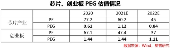 但对于这类高科技成长股而言,以PEG的估值方式更能够准确衡量其投资价值。以创业板作为对比看,芯片指数虽然有更高的估值,但匹配高速的增长率的情况下,其PEG反而比创业板更低。