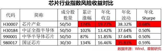 从2015年末至今,芯片产业指数的夏普比率同样更高,也同样显著优于其它同类半导体、芯片类指数,显示其更优异的投资价值。