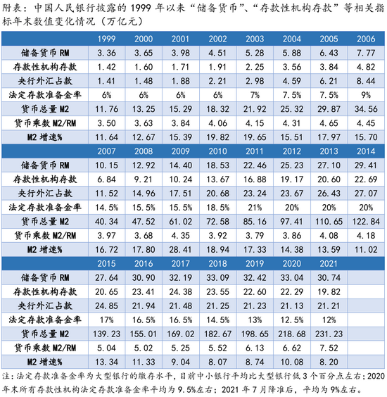 但是,如果将法定存款准备金纳入“储备货币”并据以计算货币乘数(见附表),就会出现相当反常的结果:在2006-2008年、2010-2011年大幅提准,实际上是收缩基础货币的情况下,货币总量增速保持较高水平,但货币乘数反而出现明显降低;而在2013年之后,随着降准的实施,实际上基础货币在扩大,但货币总量增速却保持较低水平,货币乘数反而快速提升。