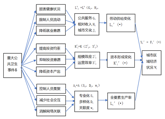 城市的经济意义体现在上面的城市产出函数上,城市i的增长一般是指区域产出Yi的增长,这是城市承载的一个重要功能:通过要素、产业和消费、生活空间的重塑实现更高的福利水平。重大公共卫生事件的发生,首先冲击的是城市的经济功能,也就是对产出函数Yi造成重大影响,冲击传导的机制则是通过函数内的各个变量发生的。