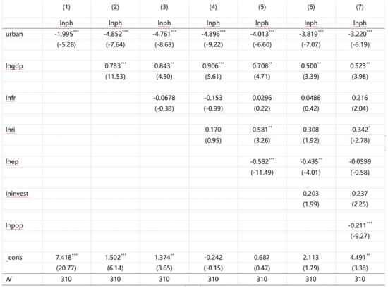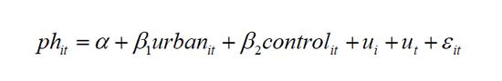其中,i表示各省份,t表示年份,urban表示各省份的城市化程度,用城市化率=城镇人口数/常住人口数来衡量;ph表示各省公共卫生和疾控状况,用各省城市疾病预防控制中心数量以及专业公共卫生机构数量来表示;control为控制变量,其中含有国内生产总值(gdp)、政府财政收入(fr)、房地产价格(ep)、城市居民收入(ri),地方固定资产投资(invest)、城市人口密度(pop)。为防止数据量级差别大,我们将模型进行半对数处理。本文选取了31个省份2009—2018年的面板数据为样本,原始数据来自于国家统计局官方网站。