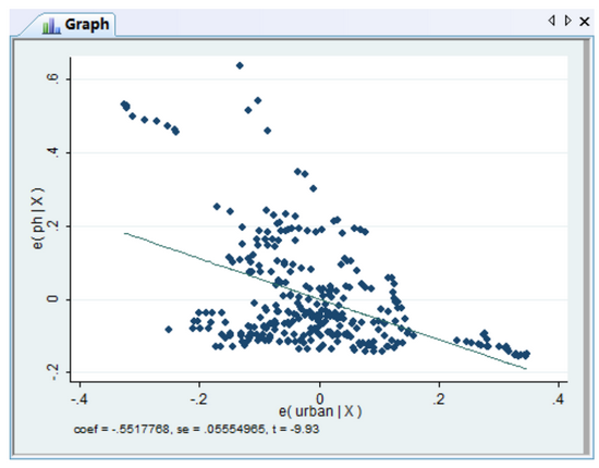 由于选取的样本统计数据较少,且固定效应模型的R2为0.8811,表明有较高的拟合度,所以我们采取固定效应模型,并剔除具有多重共线性的变量,得到的计量结果如表2。可以看到,无论哪一个方程,公共卫生及疾控资源投入与城市化之间都是显著的负向关系,且与GDP、固定资产投资、居民收入等产出类指标呈现出相对显著的正向关系,与城市人口密度则是显著的负向关系。图1所示的各省城市化与公共卫生及疾控设施投入状况二维坐标图也证明了这种关系⑤。这些都基本证明了我们上面理论分析得到的主要结论:中国快速的城市化与公共卫生资源投入之间存在相对的缺口。