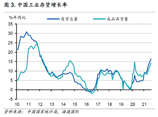 持续的通胀将激励公司增产扩容,使供应不足的问题最终得到解决。此次经济复苏与以往不同的是,当经济重新开放时,疫情期间被长期压抑的消费需求得以释放。通常情况下,因经济衰退而积压的过量库存难以在短时间内被耗尽。然而,本次经济衰退持续时间之短、经济反弹之强劲,远远超出了供应商的预期。这一现象在发达经济体中尤为显著。此外,目前中国补库存的节奏也已超过上一个库存周期(2016-19年)中的最快增速(图3)。