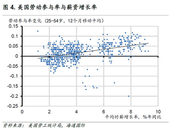 劳动力短缺最严重的行业可以通过提高薪资来吸引更多从业者。数据显示,美国时薪增长率(目前同比增长4.8%)与青壮年劳动参与率呈正相关(见图4)。然而,基于当前的工资水平,人们并不急于就业。一方面,由于疫情封锁期间家庭消费降低、存款增加,加之政府直接派发的多项纾困补助,家庭部门财务状况较为良好;另一方面,产出不足和供应链扭曲等问题抑制企业盈利,使其能提供的涨薪空间有限,无法有效解决劳动力不足。