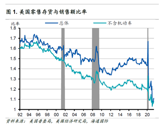总体来说,尽管产出有所提高,但物流瓶颈导致完工货品无法足量、及时地抵达终端需求所在地,所以短期内很难出现供应过剩或通货紧缩的现象。中期来看,库存储备可能持续走高,并维持在正常水平之上。疫情之后,更多厂家将吸取经验,不再采用“准时制”库存管理方式,以在未来更好地应对突发状况。这一现象可能带来一轮“补库存式的繁荣”,并为GDP增长提供比正常存货周期更持久的支持。