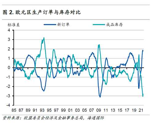 近期,投资者与消费者最关心的问题莫过于供应瓶颈和商品短缺。新闻头版多次出现货船无法在码头靠岸卸货、民众疯狂抢购石油等报道。调查显示,与当前日益上涨的消费需求相比,欧美企业的成品货物库存已达到有数据记载以来的最低水平(图1和图2)。不出所料,消费物价通胀仍处于高位,美国与欧元区的CPI同比增幅分别达到5.3%与3.4%,均为十多年来的最高水平。