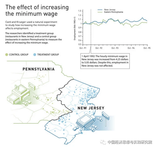 对于这个问题,如果拍脑袋来想,当然会减少。但是他们通过数据实验发现结果并非如此。他们找了相邻的新泽西州和宾夕法尼亚州去做观察。结果发现,最低用工工资提高的新泽西州,用工数量反而提高了。