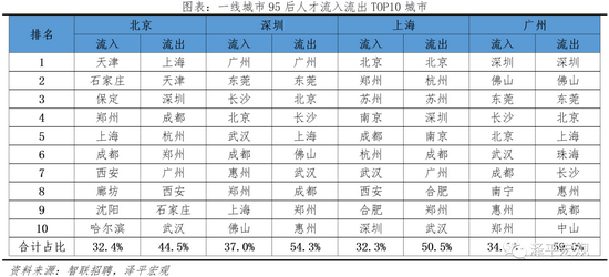 2)二线城市中,杭州、成都对95后人才集聚程度更高,人才净流入占比分别高出总体0.8、1个百分点;95后人才大部分为城市群内部流动,由于武汉地处主要经济带中心、九省通衢,其人才来源地丰富,前十大城市来自9个不同省级行政单位。从人才净流入占比看,前十强二线城市杭州、南京、成都、苏州、武汉、郑州的95后人才净流入占比分别为2.4%、1.3%、0.9%、1.2%、0.7%、0.2%,较总体分别高出0.8、0.4、1.0、0.4、0.5、0.7个百分点,杭州、成都对95后集聚程度更高。从来源和去向看,杭州流入流出城市前两名均为北京、上海,合计占比分别为7.8%、15.8%,杭州发展所需人才主要在一线城市中,杭州也具有从一线城市抢夺人才的能力;南京流入流出城市均有8个位于长三角地区,合计占比分别为21.5%、41.5%,南京和长三角的人才互动非常频繁,部分因为南京高校较多,长三角人才为求学向南京集聚,毕业后从南京回流至长三角其他城市;95后人才向成都流入和从成都流出的前十大城市合计占比分别为35.3%、43.6%,流出成都的城市更集中;苏州流入流出城市均有5个在长三角地区,占比分别为18.7%、36.79%,其中上海对苏州虹吸效应明显,从苏州流向上海95后人才占比为14.6%;武汉地处长江与京广铁路大动脉的十字交汇点,有“九省通衢”之称,95后人才来源地遍布各地,前十城市中来自9个不同的省级行政单位。流出武汉的城市更集中,其中流出前四大城市为深圳、北京、上海、广州,均为一线城市,合计占比27.5%;流入郑州城市有9城位于中原城市群,占比35.9%,流出郑州城市有6城位于中原城市群,其余4城为北上深广。