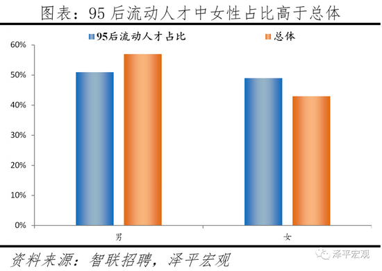 1)从性别看,95后女性求职占比更高,95后、总体流动人才中女性占比分别为49%、43%。95后、总体流动人才男女比例分别为51:49,57:43,95后流动人才中女性占比更高。可见95后女性受教育程度高且独立,求职意愿较强。