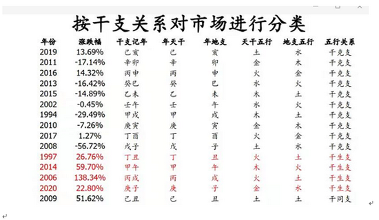 国盛证券的分析师给大家整出了一点儿新花样,用几千年前老祖宗的玩意儿,来推演股市的涨跌。说白了,就是用阴阳五行、天干地支算命。他们还整出了一个大数据分类,通过天干分类发现,全部上涨的年份是丙、丁、己,全部下跌的年份是戊、辛;按照地支分类,年份是辰、丑、午全部上涨,全部下跌的年份有巳、寅。