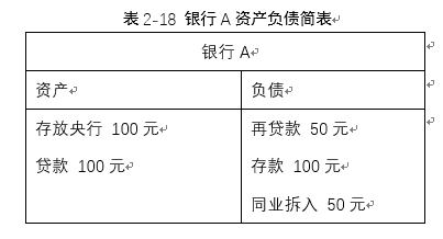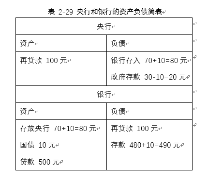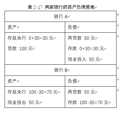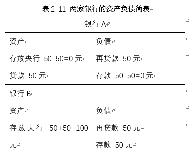 现在引入银行A和B,央行以再贷款的形式,分别向两家银行投放了50元的基础货币,见表2-9。