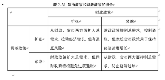 财政的目标分两方面:一方面是日常的财政收支工作,主要用于政府的正常运营;另一方面是运用合适的财政政策,起到宏观调控的功能。货币政策和财政政策的不同组合请见表2-31。