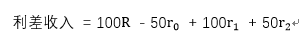 银行A从央行获取了50元再贷款,利率为r0,然后它的存款利率为r1,同业负债利率为r2,而贷款利率为R,存放央行的准备金的利率忽略不计。此时,银行可以赚取利差收入,即: