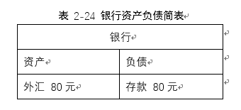 现实中,央行的基础货币余额中超2/3为外汇占款,贸易顺差和吸引外资导致大量外汇流入我国。比如,某出口企业从海外客户那赚取了10美元,它要将这10美元卖给银行,换取人民币80元,形成了一笔广义货币,而银行持有了折合80元人民币的外汇资产,见表2-24。