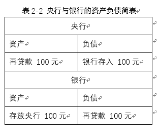 首先是发行货币。央行给银行发放的贷款可以暂且统称为“广义再贷款”,或 “再贷款”。同时,银行在央行开立准备金账户。银行拿到再贷款的资金后,又存回开在央行的这个账户中,形成一笔准备金。以100元再贷款为例,如表2-2,准备金是真正意义的由央行签发的货币,叫基础货币。而再贷款是央行向银行投放基础货币的主要手段。