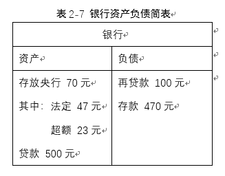 那么,现在银行必须有47元的法定存款准备金,超过47元以上的部分,即23元,则称为超额存款准备金,见表2-7。