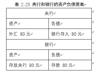 然后,假设银行把全部外汇卖给了央行,换回了80元人民币的基础货币,存在央行,见表2-25,这种外汇资金流入的方式,既投放了基础货币,又投放了广义货币,均为80元。