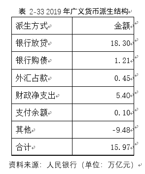 上表的含义是:2019年广义货币增长率为8.7%,其中,银行发放贷款派生、银行购买企业债派生、财政净支出的投放、其他投放(银行购买资管产品等)分别贡献这了8.7%中的10.0、0.7、3.0、-5.2个百分点。可见,银行放贷是派生广义货币的主力,贡献了广义货币增长率中的约10个百分点,而银行赎回资管产品回笼了广义货币,拉低了广义货币增速约5.2个百分点。