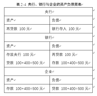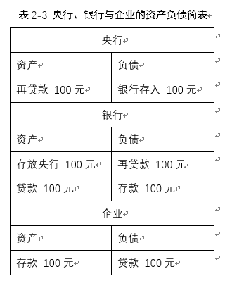 然后,有一家企业来申请贷款100元,具体操作为:银行先给企业100元,企业领到100元,又存回它开在银行的账户中,形成存款100元,如表2-3所示: