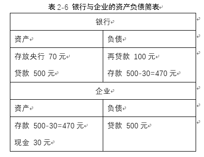 接上例,如果企业有30元取现需求,那么银行要先去央行取回30元现金,报表变为表2-5: