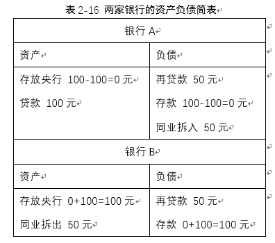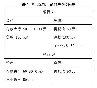 这时,假设银行A先向银行B以同业拆借的方式借入50元,报表变为表2-15: