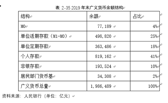 再考虑广义货币内部结构。2019年全年,15.97万亿元的广义货币被不同方式派生出来后,便投入了社会流通,会形成广义货币在不同群体间的分布,2019年末,广义货币余额在上述几种人群间的分布结构是(见表2-35):