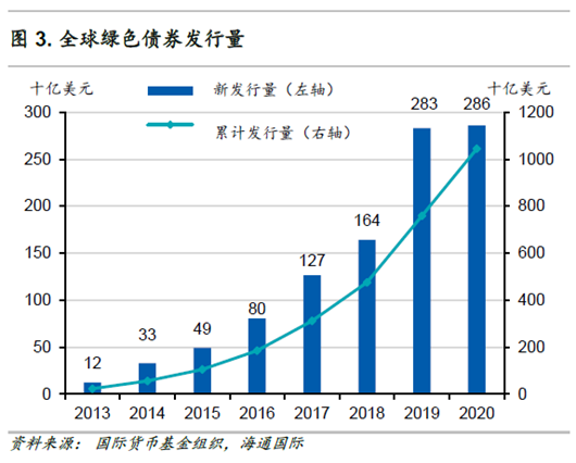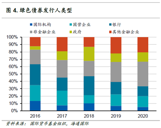 其他央行采取类似策略的进度可能早于很多投资者的预期。一方面,正在进行QE、并对市场影响力较大的欧央行和日本央行,此前已在多次官员讲话中明确表示会把应对气候变化纳入政策目标。而像挪威、香港等管理着政府投资基金和主权财富基金的国家与地区可能扮演着更加重要的角色:投资是永久性的,但QE在理论上只应该是暂时的。在实行QE政策时,央行倾向于购买主权债,然而,即使绿色主权债的供应量会随着绿债市场的发展迅速增长(图3),其发行量仍小于私营部门(图4),所以绿色企业债仍是执行绿色QE政策的重点。