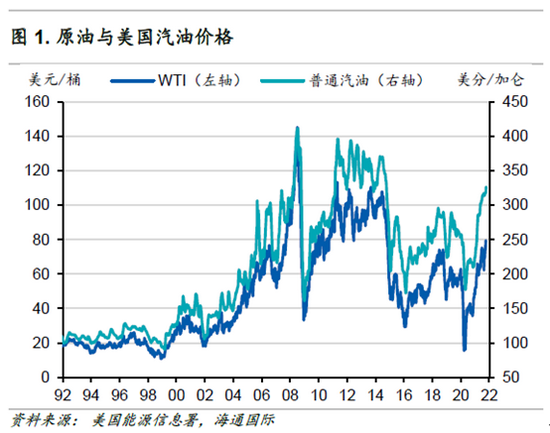 当然,油价的上涨也会几乎一比一地迅速反应到汽油价格上,抑制消费者支出,影响消费者情绪(图1)。