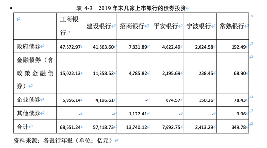 金融投资目前包括以公允价值计量且其变动计入当期损益的金融资产、以公允价值计量且其变动计入其他综合收益的金融资产、以摊余成本计量的金融资产等子科目。银行投资的债券以政府债、金融债等利率债为主,另外有少量的企业债(见表4-3)。