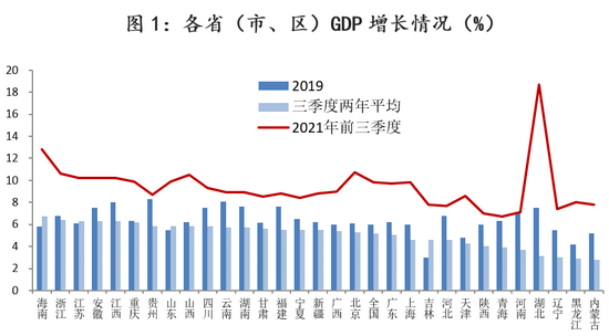 第三,部分转型发展较好的地区经济表现更为突出。东部地区中,海南增长表现较为突出,其消费、投资增速位居全国前列,这与自贸港建设等政策支持效应下服务业发展较快有关,前三季度其第三产业增加值同比增长17.4%,对经济增长贡献率达到81.3%,两年平均增长9.3%。北京工业增加值增速位居全国第一,今年前三季度同比增长38.7%,两年平均增速为17.7%,这主要是由于医药、高技术、战略性新兴产业增长较快,前三季度分别增长3.3、1.4、1.1倍。虽然北京工业占比较低,今年前三季度仅为13.8%,但其较快增长对GDP增速发挥了重要拉动作用。江苏、浙江高技术产业发展较快,前三季度江苏高新技术产业产值同比增长25%,占规模以上工业的48.1%;浙江着力推动数字化改革,数字经济发展势头强劲,前三季度数字经济核心产业增长24.2%,两年平均增长19.2%。中部地区中,江西表现较为突出。江西省消费、投资、出口增速均居全国前列,这与近年来推动产业结构转型升级有关,电子信息产业加快引进和培育,在工业中占比提高到17%,装备制造、战略性新兴产业较快增长。重庆引领西部地区发展,其GDP两年平均增速高于其他西部地区,2021年前三季度增速也是西部地区中唯一高于全国GDP增速的地区。