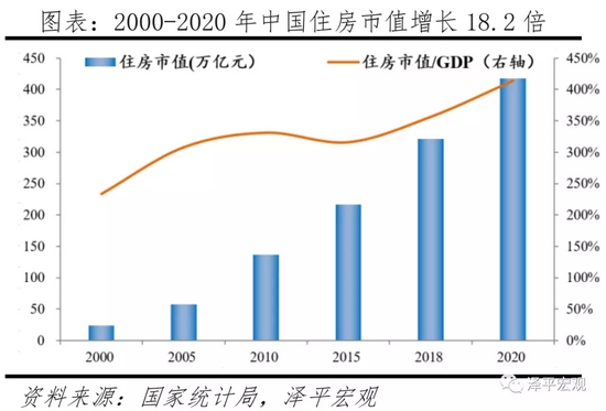 根据我们在《中国住房市值报告:2021》测算,2000-2020年中国住房市值从23万亿元增加到418万亿元,年均增长15.6%,超名义GDP的12.3%。因2020年疫情影响了经济,住房市值与GDP的比例从234%增至414%。2000年中国住房市值仅23.4万亿元,人均1.8万元,住房市值与GDP比例为233.7%。2010年中国住房市值为136.7万亿元,人均10.2万元,住房市值与GDP比例为331.1%。到2020年,住房市值达417.9万亿元,人均达29.6万元,住房市值与GDP比例为413.7%。国际上,从住房市值与GDP的比例看,2020年中国为414%,高于美国、日本、德国、英国、法国的148%、233%、271%、339%、354%。中国住房市值与GDP比例较高源于人地错配,一二线高房价,三四线高库存,导致全国住房市值较高。