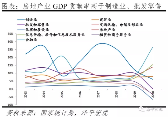 住房制度全面市场化以来,房地产业对经济增长的贡献率也在增加。2000-2020年房地产业对GDP增长的贡献率从4.8%波动增至13.9%。从时间点上看,在2009年、2016年和2020年,GDP增速降低而房地产业对经济增长的贡献率为14.2%、12.9%、13.9%,均高于平均水平。主要原因是,2009年我国在金融危机后经济增速回落,推出了“四万亿元计划”,为扩大内需取消了商业银行信贷规模限制,部分资金流入房地产业。2016年我国面临地方政府债务加剧、经济持续下行,采用降低购房贷款利率及首付比例等手段调控房地产市场,同时开始了房地产“去库存”计划。2020年面对疫情冲击导致的世界经济衰退,我国制造业、批发零售业产业增速受到影响,而房地产作为经济发展的对冲项,发挥一定作用。2020年制造业、批发零售业、房地产增加值增速为0.68%、0.04%、5.8%,前值为3.2%、7.6%、9%。