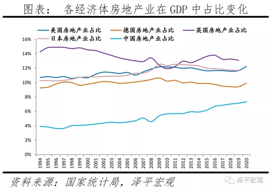我国房地产业占比低估主要原因:其一,我国居民自有住房部分的增加值存在低估。以英国为例,居民自有住房部分增加值在全国GDP中占比9.2%。我国未公布居民自有住房增加值,但根据个别城市统计局数据,如石家庄、大连市的居民自有住房增加值仅占全市GDP中2.7%、3.5%,占比房地产业中66.5%、62.9%。其二,我国住房自有率高、租赁比例低。2000—2010年我国城镇家庭租房比例维持在21%左右,明显低于德国(55%)、英国(38%)、日本(39%)、美国(36%),因此租赁市场的贡献更低。其三,在房地产相关服务方面,发达国家多进入住房存量阶段,其物业管理、经纪与代理等服务更为成熟,贡献值更高。2019年英国房地产服务活动增加值为229.7亿英镑,占GDP的1.0%;我国虽未公布全国的物业管理及房地产中介服务增加值,但以石家庄、大连市为例,在全市GDP中占比分别仅0.3%、0.5%。
