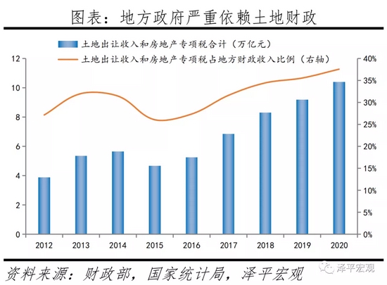 从地方财政收入构成看,地方政府依赖土地财政,2020年土地出让收入和房地产专项税合计占地方财政收入的37.6%。
