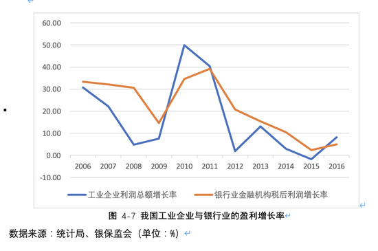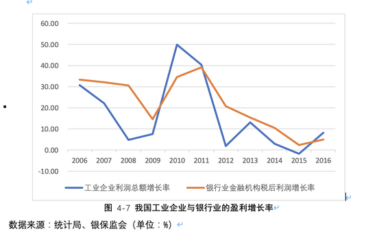 比如,2008年经济下行,工业企业盈利增速快速回落,银行业盈利增速则次年才明显回落。2010年和2016年经济复苏,则是相反,工业企业盈利增速反弹,显著超出银行的盈利增速反弹(见图4-7)。