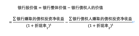 (1)银行整体价值:是银行未来赚取的债权投资净收益的折现,取决于资产规模、净息差、不良资产损失等因素。