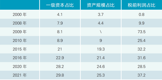 中国上榜银行一级资本合计在2008年超过德国,2009年超过英国,2010年超过日本,2014年超过美国。2001、2011、2021年,中国上榜银行一级资本在千家大银行中的占比分别为5%、11%、30%。