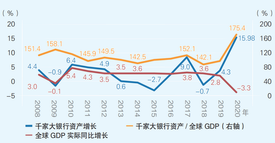 从千家大银行资产总规模和全球GDP增长率来看(为方便与GDP比较,本段千家大银行数据为实际年份数。其他段落年份均为发布年份,数据为上年数),2008-2019年,千家大银行资产规模平均增速低于GDP增速,千家大银行总资产与全球GDP之比从2007年的159%下降到2019年的146%。2009年,受金融危机影响,千家大银行资产和全球GDP均为负增长。但2020年,受疫情影响,全球GDP负增长(-3.3%),为了缓解疫情对经济的冲击,各国采取了宽松的货币信贷政策,千家大银行资产增速高达16%,千家大银行总资产与全球GDP之比升至175%,详见图3所示。