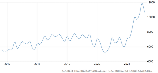 美国近五年来职位空缺变化(Via TradingEconomics)