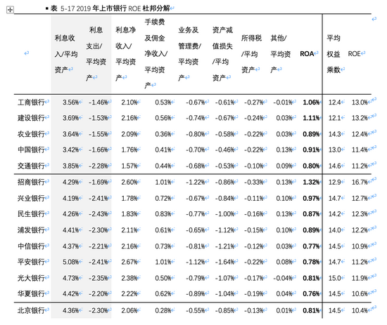 资料来源:各银行年报(表中平均权益乘数、ROE的计算均剔除了优先股,因此两者之积与ROA有所差异。此外,由于估算平均净资产时用的是期初期末简单平均,因此和上市银行实际披露值也会有小幅差异)