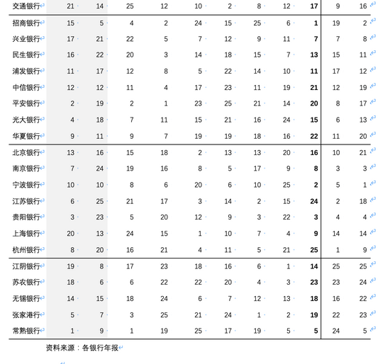 对于每一项指标,将表5-17中全部银行进行排名,较优者排名靠前,见表5-19: