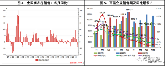 1)房地产销售持续下滑。9月份全国商品房销售面积当月同比下跌13.2%,连续3个月同比负增长;百强企业销售额10月份同比上年下降32.2%,绝对金额连续3个月环比回落。