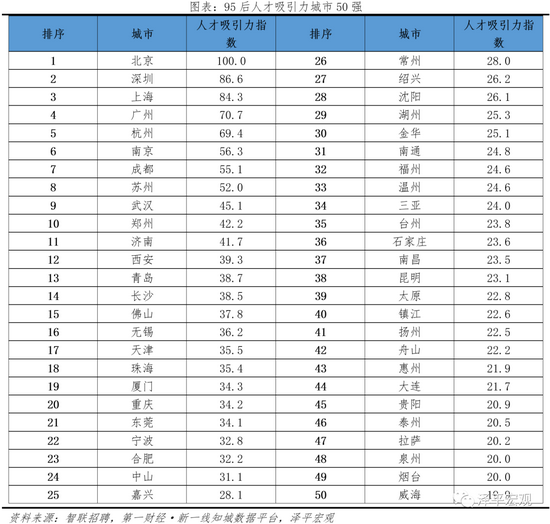 从95后人才吸引力指数看,北京、深圳、上海位居前三,广州、杭州、南京、成都、苏州、武汉、郑州位居前十。此前,我们和智联招聘联合推出的《中国城市人才吸引力排名》中定义人才吸引力指数为人才流入占比、人才净流入占比、应届生人才流入占比、硕士及以上人才流入占比、人均可支配收入、人口净流入的加权结果。95后年轻人才成长于经济高速增长时代,生活富足,更倾向工作发展和享受生活的平衡,选择就业城市不仅关注薪资,还关注创新环境和文娱产业发展情况。基于数据可得性,本文选取人均可支配收入(权重10%)、每万人专利授权数量(权重10%)和每百万人电影院数量(权重10%)作为外部指标,叠加智联招聘提供的95后人才流入占比(权重20%)、95后人才净流入占比(权重20%)、95后应届生人才流入占比(权重15%)、95后硕士及以上人才流入占比(权重15%)四个内部指标构建95后人才吸引力指数。从结果看,作为政治、经济、文化中心的北京位居榜首;深圳位列第二,相比总体人才,深圳对95后年轻人才的吸引力超过上海。深圳在一线城市中人口结构最年轻,15-59岁人口占比为79.5%,高于北京、上海、广州的68.5%、66.8%、74.2%。并且根据我们选取的创新和文化指标,深圳在前20强中分别排第一和第二,同时深圳拥有低于北京和上海的落户门槛,随着人口承载能力受限,年轻人才在深圳收紧落户门槛窗口期也将积极抢占人才高地,创新的产业结构、丰富的文娱活动、更低的落户门槛吸引年轻人到深圳就业;上海、广州依次为第三、四名;二线城市杭州、南京、成都、苏州、武汉、郑州跻身前十强。在前50强中,东部、中部、西部、东北地区分别有36、6、6、2个;一二三四线分别有4、29、15、2个,分别占一二三四线城市数量的100%、82.9%、18.5%、1.1%;长三角、珠三角、京津冀、成渝、长江中游城市群分别有18、7、3、2、3个。