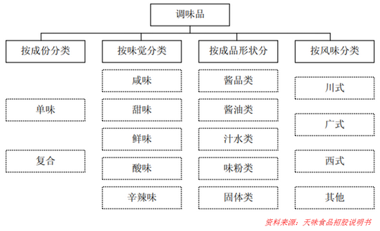 按照产品成分,调味料分为单味调味品(基础调味品)和复合调味品。其中,单味调味品以味精、酱油、醋、腐乳、香辛料、料酒等为代表,原材料构成单一;相比之下,复合调味品则由两种及以上主要成分构成,鸡精、复合调味酱、酱腌菜、火锅调料、中式复合调味品、西式复合调味品等均是典型代表。国际上看,单味调味品与复合调味品的销售额结构约为2:8,以复合调味品为主;国内市场则与之相反,单味调味品仍为主流,复合调味品仍有很大空间。