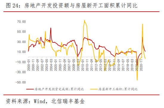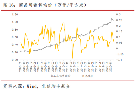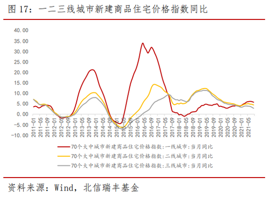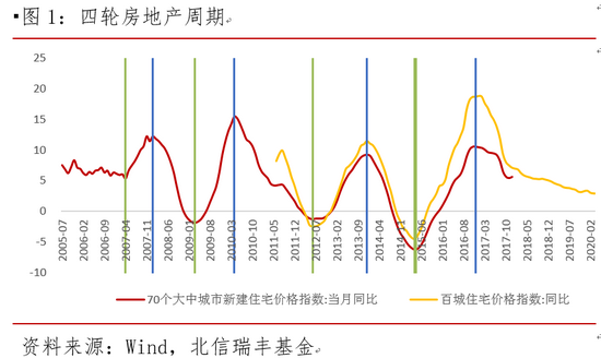 资料来源:Wind,北信瑞丰基金然而,目前房地产市场所处于的第四轮周期却与前三轮周期大不相同。本次第四轮周期从2015年4月开始以来,一直延续至今,持续时间超过6年。究其原因,异常主要出现在本轮周期的下降段上。本轮周期的上升段从2015年4月持续到2016年12月,总计20个月,与前三轮周期并无明显差异。而下降段则从2016年12月持续至今接近5年仍未明显反转。从图形上可以看出,住宅价格指数同比增速在经历2016年12月到2017年年底2018年年初的迅速下降后并未开始反弹,而是转入了一个缓慢下降的全新阶段。在这一新阶段,住宅价格指数同比增速的波动幅度较之前明显收窄,总体上处于缓慢下降的趋势。